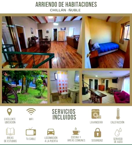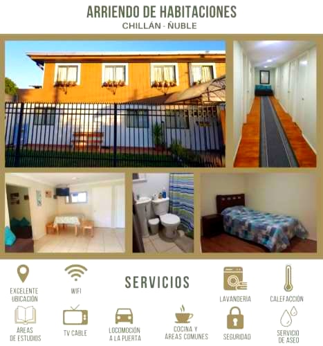 Habitaciones individuales para tener una grata y cómoda estadía. Cada arriendo incluye servicios básicos (agua, luz, gas, calefacción, aseo (lunes a viernes), internet y tv cable). Adicionalmente puede optar al servicio de lavado y secado de ropa. Contamos con áreas comunes para estudios, esparcimiento y cocina. Estamos ubicados en dos direcciones en la ciudad de Chillán, cercano a Hospital, Universidades, supermercados y Avenidas Principales. PARA MAYOR INFORMACION DIRECTAMENTE o WhatsApp