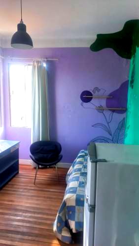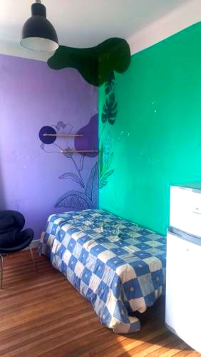 Descripción de Habitación: Cama de una plaza, Ropa de Cama , MIni Refrigerador, Mesa, Closet de 1 cuerpo y decoración de pared y de interiores.