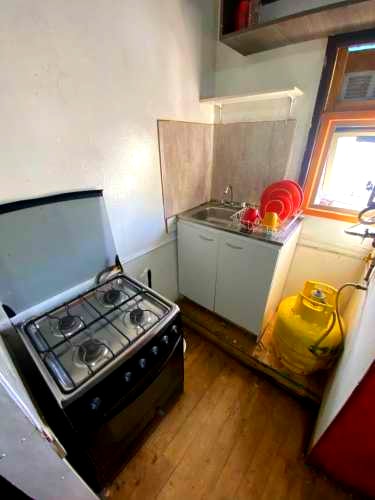 Tiene frigobar, cocina, closet, mesa y cama de 2 plazas