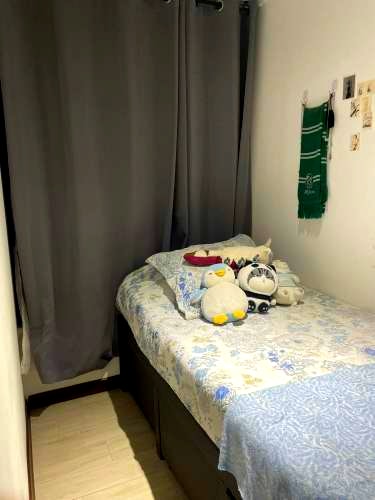 La habitación permite cama de una plaza y velador, y cuenta con clóset amplio y profundo. (La cama de la foto no está incluida.)