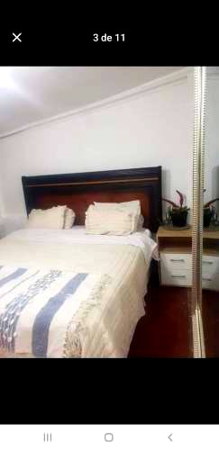 La habitación es grande con baño privado, cama King, veladores, colgador de ropa, muebles.