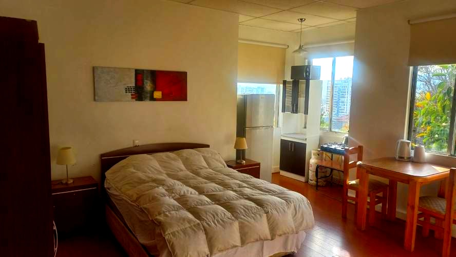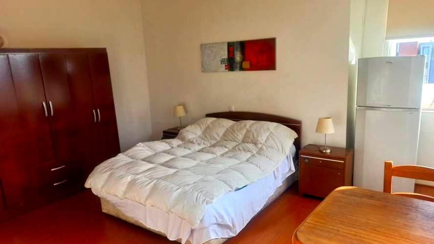 Descripción de Habitación: Cama de dos plazas, Ropa de Cama, Refrigerador, Mesa con 2 sillas, Closet de 3 cuerpos, TV de 43”, 2 Veladores, 2 lámparas, Mini Cocina con su balón de Gas, Hervidor de Agua y Microondas.