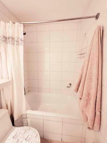 Baño con tina, frente a la habitación, compartido solo con 1 persona
